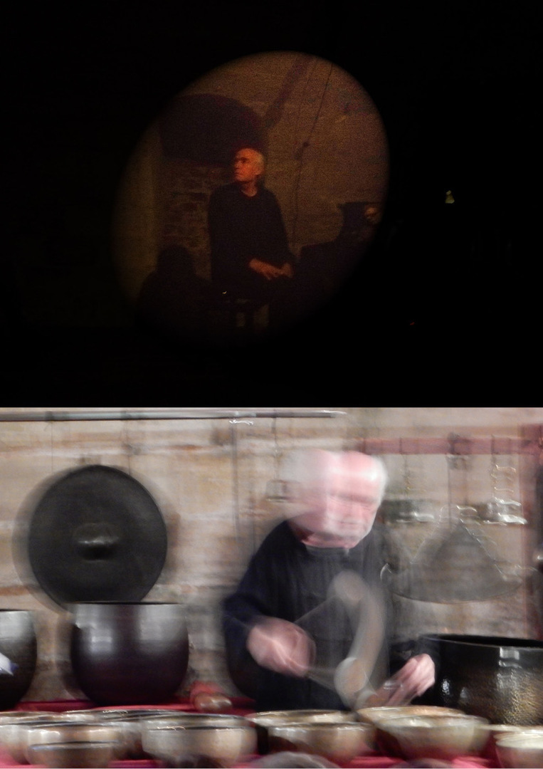 Improvisation avec la chorégraphe Carolyn CARLSON (Bols bouddhiques et gongs) au Musée GUIMET, au milieu des Bouddhas Khmers.